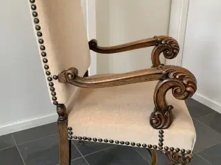 Entrébord eller pyntebord i sandblæst og afsyret eg med to skuffer. Bordet står på fire drejede ben og har en brun træfinish, hvor åretegningen i træet er synlig.