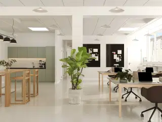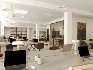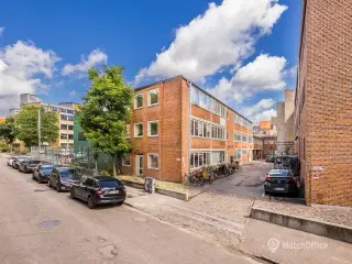 **Kreativt og pulserende kvarter i Nordvest med plads til moderne erhverv** Forlagshuset ligger i Nordvest – et tidligere industrikvarter i udkanten af København, der de seneste år har gennemgået en stor udvikling. I dag fylder produktionsvirksomhederne mindre, og i stedet har gallerier, medievirksomheder, kreative erhverv, kontorfællesskaber, arkitekter, foreninger, iværksættere og caféer vundet indpas i kvarterets rå, hippe og multikulturelle miljø. Lejemålet fremstår højloftet og råt – et ideelt valg for virksomheder eller studier, der ønsker et inspirerende rum med kant. De mange vinduer giver et fantastisk lysindfald, og den generøse loftshøjde får lokalet til at virke endnu større, end det er. Kontoret er i dag indrettet som et storrumskontor, men udlejer er indstillet på at etablere et mødelokale efter lejers behov. Bagerst i lokalet findes et pænt gråt køkken med spiseplads samt et åbent depotrum, der giver praktisk opbevaringsplads. **Historisk hvidpudset ejendom med moderne touch og hyggelig gårdhave** En karakteristisk hvidpudset ejendom med markante, sorte vinduespartier, der tidligere husede forlaget og trykkeriet Gyldendal. Ejendommen er opført i 1930’erne, og er efterfølgende moderniseret i 1960 og igen i 2007. Til ejendommen hører desuden en hyggelig, fælles gårdhave, hvor det er muligt at nyde sin frokost eller afholde fredagsbaren under åben himmel. Lejemålets energimærke er angivet til: B