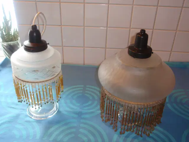 2 stk. gamle lamper med perler. 1 stk. stor lampe pris: 400,- 1 stk. mindre lampe pris 300,- Lamperne er fra ca. 1930 - 1940