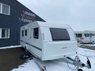 Helårsisoleret, Dobbeltseng, Køjer, Rundsiddegruppe, Køkken med Kogeblus, Stort køleskab med fryser, Varmt vand, Fast vandtank, Varmeovn med blæser, Elektrisk gulvvarme, Toiletrum m/ fast toilet, TV-holder, Myggenet i døren, Tagluge, Serviceklap, Glatplade, Træktøjafdækning, Truma combi 6E 5.296.-, TV holder 1.374,-, Vognens pris kr 286.980, Samlet pris kr 293.650,-.