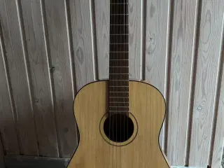Klassisk akustisk guitar i naturtræ-look. Kroppen har traditionel rundet form med lys træfarve og dekorativ roset omkring lydhullet. Guitaren har nylonstrenge, slotted headstock og mekanikker med plastknopper. Egnet til fingerspil, akkordspil og generel øvning på klassisk eller akustisk guitar. Mærke og model fremgår ikke tydeligt af billederne. Med taske.