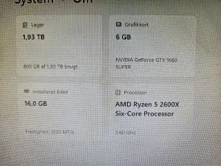 Hej jeg sælger denne computer den virker godt Windows 10 kan godt opgraderes til Windows 11 SSD )Den har. 480 GB plads RAM )Den har. 8 GB ram CPU )Den har en. intel core i5-9400f 2,90 GHz GPU )Den har en. NVIDA GeForce GTX1060 3GB Har brugt den til at spille CS og Fortnite og lave lektier på. Fortnite 240/320 fps Cs 2. 175/240 fps Stil bare spørgsmål!!