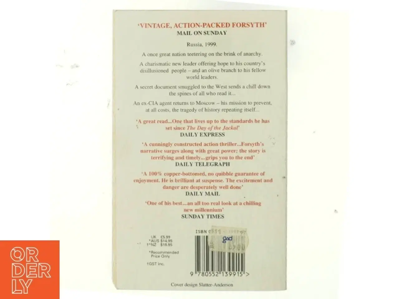 Klik på 'Se annoncen hos forhandleren' for at se varen i vores webshop I slutningen af 1990'erne baner misvækst, kriminalitet og inflation vejen for nationalistiske fascisters overtagelse af magten i Rusland. I Vesten beslutter en gruppe statsledere derfor at sende en tidligere CIA-agent til landet for at redde situationen Forfatter: Frederick Forsyth Forlag: Corgi Udgivelsesår: 1996 Sider: 541 Sprog: Engelsk Brand: Ukendt Farve: Ukendt Stand: 60 - Vi sender til hele landet for 49 kr. Leveringstiden er 1-3 hverdage. Du kan også gratis hente den på vores lager på Industrivej 10 i Slangerup. Er du i tvivl om varen stadig er til salg? Klik på knappen "Se annoncen hos forhandleren" for at se den i vores webshop. Kan du se den der, er den stadig til salg Orderly er en ny måde at købe brugt på. Vi har alle vores sælgeres ting på vores centrale lager. Derfor kan du være helt sikker på at få dine ting - og du kan samle flere ting på tværs af sælgere og kun betale én gang fragt.