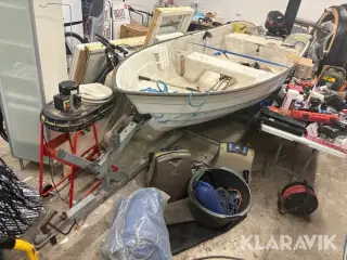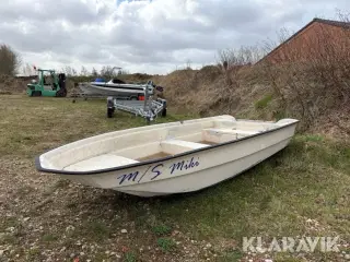 Skal afhentes på Autotrailer. Speedbåd + bådtrailer År: Ukendt Serienummer båd: Ukendt Serienummer motor: Ukendt Motor: Mercury 75Hk Mål og vægt Længde (m): 4,5 Bredde (m): 1,6 Højde (m): 1,5 Læssehjælp: Læssehjælp er ikke tilgængelig Antal nøgler: 1 Udstyret med: - Kaleche Registreringsattest på bådtrailer medfølger ikke. Står uden nummerplade/Nummerplade medfølger ikke til bådtrailer.