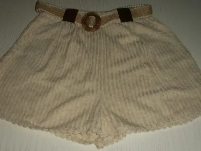 Meget smart beigefarvet sommersæt med bluse og shorts. Blusen er uden ærmer og rund hals med pæn tungekant og små brune knapper. Shorts er med to lommer med tungekant, og bælte med smart træspænde. Sættet er aldrig brugt