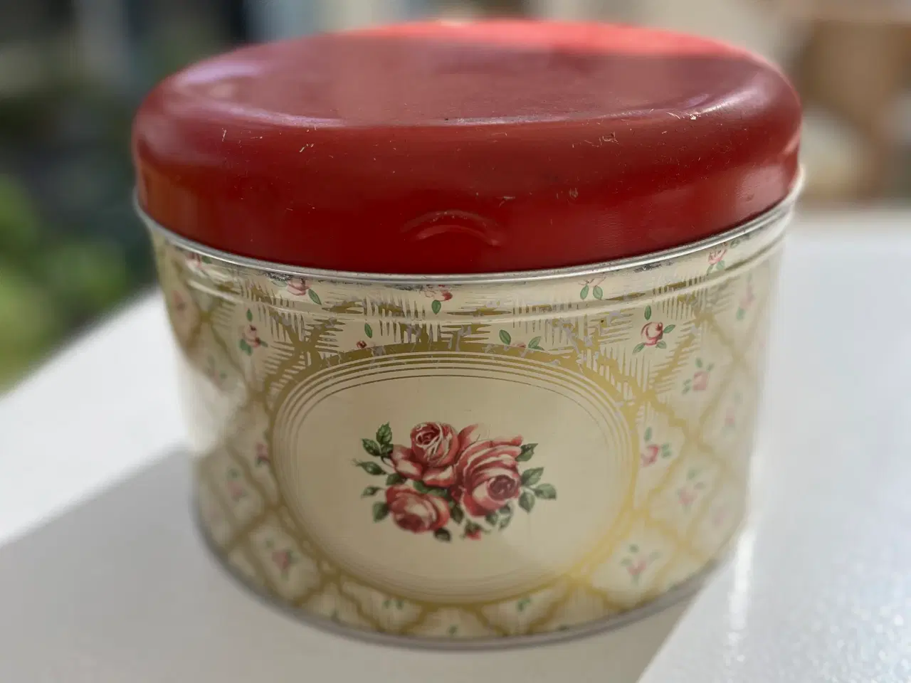 Smuk og dekorativ gammel engelsk kagedåse - højde 16 cm og 21 cm i diameter