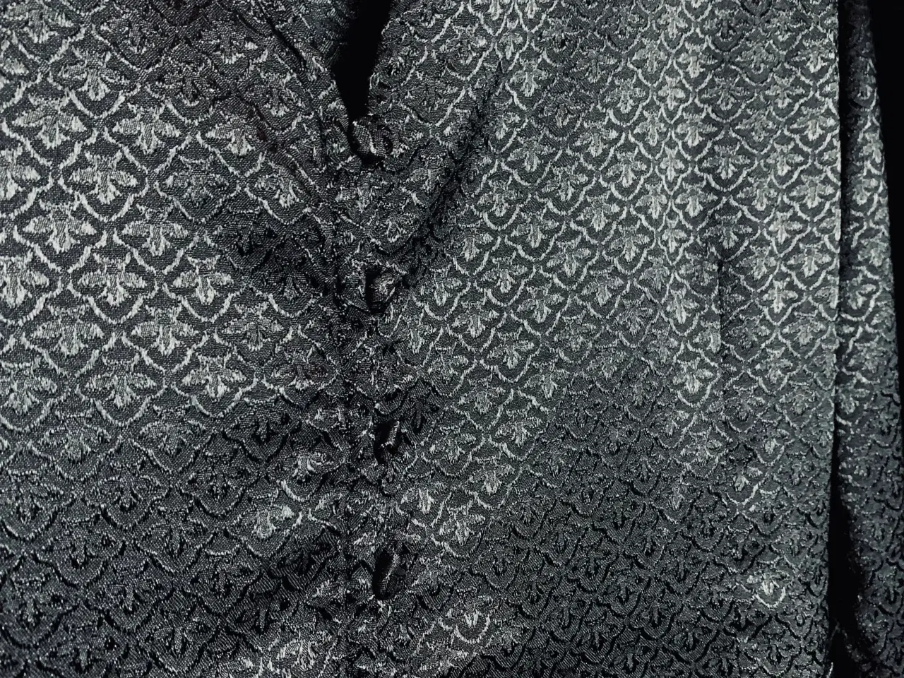 Fin sort kjole i brokademønstret stof, med lange lette ballonærmer, let svaj i skørtet og knapper ned langs brystet. Længde: 95cm Brystomkreds: 104cm Taljeomkreds: 92cm Fra røg- og dyrefrit hjem.