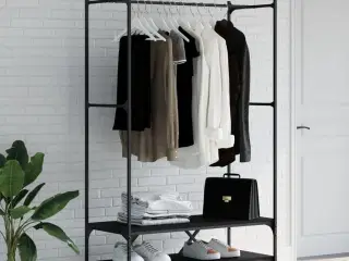 Dette alsidige tøjstativ giver dig med det samme en praktisk og flytbar opbevaringsløsning til at hænge tøj op. Stativet er fremstillet i rustfrit stål af høj kvalitet, som gør at det holder i mange år. Med bøjlestangen, der kan forlænges op til 150 cm, er tøjstativet designet til at maksimere ophængningspladsen, mens det bruger mindst mulig plads i rummet. Dets højde kan justeres fra 108 cm til 170 cm. Takket være fire jævntkørende 360 ° drejehjul kan tøjstativet nemt flyttes. To af hjulene er udstyret med bremser, hvilket giver ekstra stabilitet. Desuden er det nemt at montere og vedligeholde. Det kan også skilles ad for nem opbevaring. Vores mobile tøjstativ er let, stærkt og stabilt til opbevaring eller transport af din garderobe. - Slidstærkt stel i rustfrit stål + PP-plastikfod - De sorte stænger har pulverlakeret finish - Længden kan justeres fra 84 cm til 150 cm - Højden kan justeres fra 108 cm til 170 cm - Bredde: 42 cm - Med 4 hjul, hvoraf 2 er udstyret med bremser - Med en bøjlestang - Samlemanual er inkluderet. - Let at samle