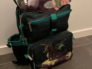 Smart skoletaske inkl sports taske fra Jeva, som er kendt for gode og ergonomiske tasker. Tasken er i god stand og er grå med flotte skater motiver på.