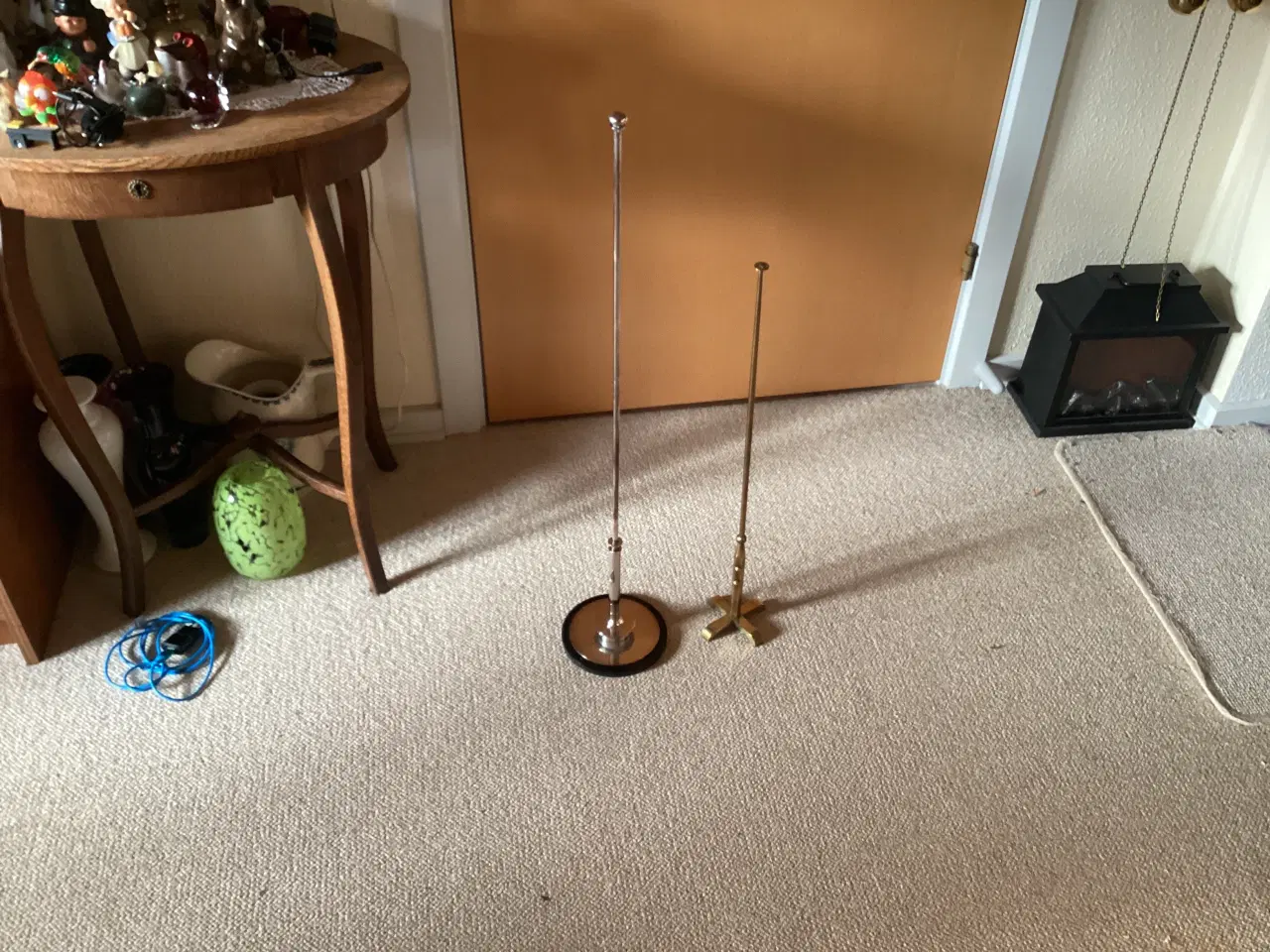 Bord Flagstænger 1ste Sølvlignende metal mrk. ATLA med flot flagknop H. ca 80 cm. nederste fodstykke sort bakkelit 15 cm i diam. næste plade ca 13 cm i diam. Nr. 2 er messing med kors fodstykke og det nederste af stangen er sekskantet ca 12 cm op. H.59 cm. U. Flag. Samlet pris 175,00 kr.
