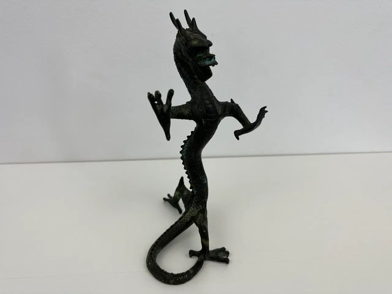 Der er her tale om en flot patineret antik kinesisk drage / figur i bronze. Måler ca. 23,5cm i højden, 12,5cm i bredden og 13,5cm i dybden. Perfekt til samlere eller blot til indretningen. (se billederne) Ps: se også mine andre annoncer med samleobjekter!