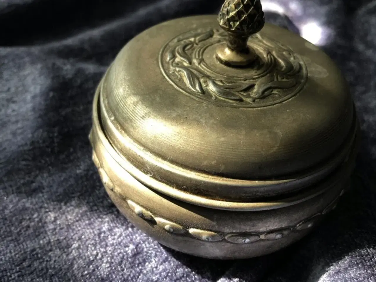 Lille tin-dåse med fin ornamentik - 8 cm i diameter – 7 cm høj Jeg bruger ikke G & G-forsendelsesmetode men står selv for forsendelsen. Jeg sender med DAO - det har fungeret upåklageligt i mange år – skriv en besked, hvis du er interesseret i, at jeg sender.