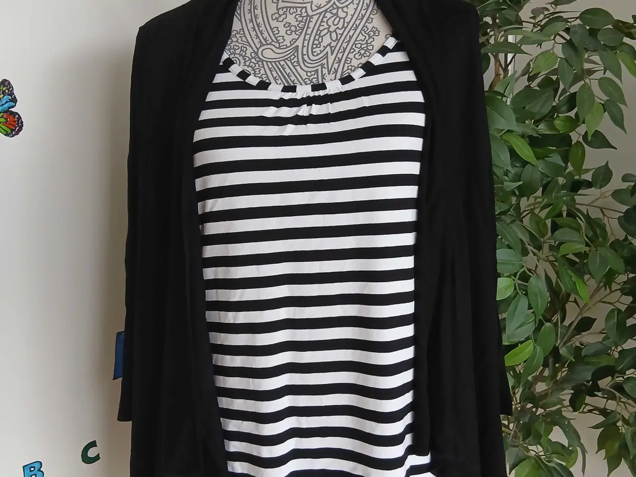 455. Blusen består af en stribet top med korte ærmer og en sort cardigan med lange ærmer. Cardiganen er åbenstående og har en løs pasform og er syet sammen med toppen har en rund halsudskæring med en lille rynkedetalje. 95% Viskose 5% Elastane, Ny med mærke 499kr Bryst 96cm Længde 64cm 3/4 Ærmelænde 33cm Sende med dao eller bring Se også al det andet tøj jeg har til salg