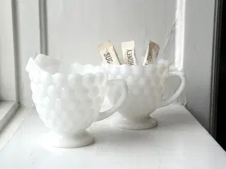 Gammelt sæt bestående af opsats og kande af grønt glas, med gylden deko. Brug det til sukker og fløde, karameller og chokoladesauce, nødder og dressing, krymmel og karamelsovs osv. Opsatsens deko er mere udvisket end kandens. Kande: 10 cm høj - Skål: Ø12 x 12 cm