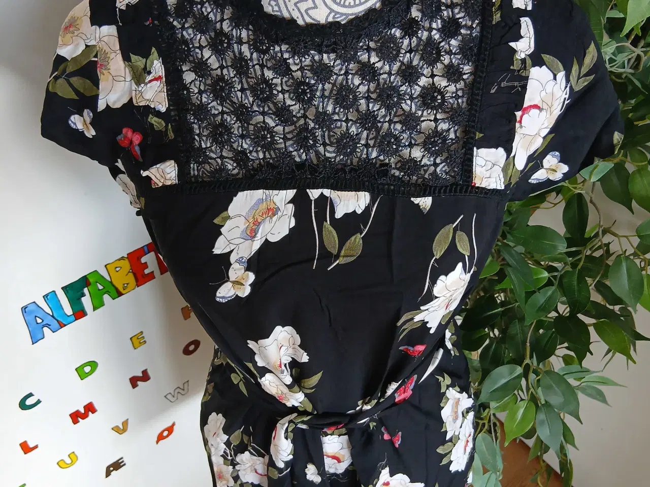 445. Kjole med sort bundfarve og et blomstermønster i hvide og grønne nuancer. Kjolen har en sort blondekant ved halsen og en bindebælte i taljen. Den har korte ærmer og en længde, der når til knæet. 100% Rayon / viskose Bryst 88cm Længde 82cm Sender med dao eller bring Se også al det andet tøj jeg har til salg