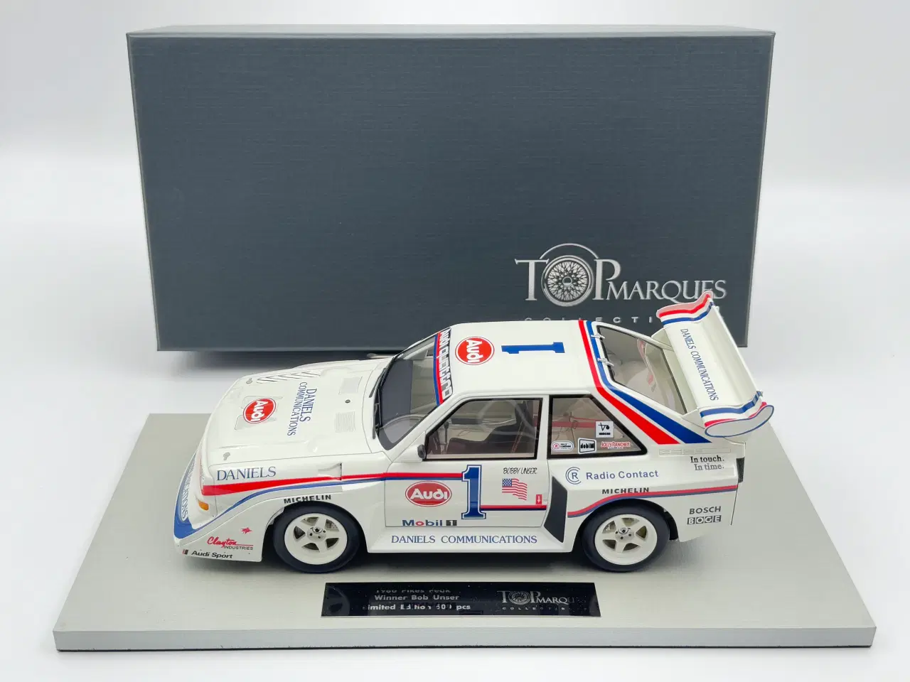 1986 Audi Quattro S1 Pikes Peak 1:18 Driver: Bobby Unser "Bob Unser" Vinder bil fra "Pikes Peak Bergrennen 1986" / The Pikes Peak International Hill Climb https://www.youtube.com/watch?v=5mHgtz2rzQg Limited Edition 500 stk. - Super god kvalitet. Fremstår som ny og ubrugt i original emballage Producent: Top Marques Scala: 1/18 Se også mine andre modelbiler tilsalg her på siden fra AUTOart - Kyosho - Exoto - HotWheels - NOREV - Minichamps - Otto - GT Spirit - Rally WRC RS Kan sendes for 59,- med tracking ...ved køb af flere betales fragten kun én gang. Jeg kan levere uden mer pris langs E45 motorvejen fra Aalborg til Kolding