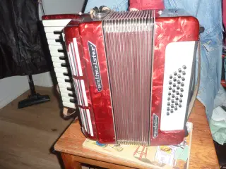 Det er en svedano harmonika det er en lille flot harmonika den er rød der er rem med og den spiller rigtig godt der er ingen fejl på den og ingen fejl i den overhovedet der er kuffert med til den og i kufferten er der en ekstra rem og noder med til den så alt i alt en rigtig fin harmonika det spiler suverænt godt og er i suverænt god stand det er en suverænt god harmonika til prisen