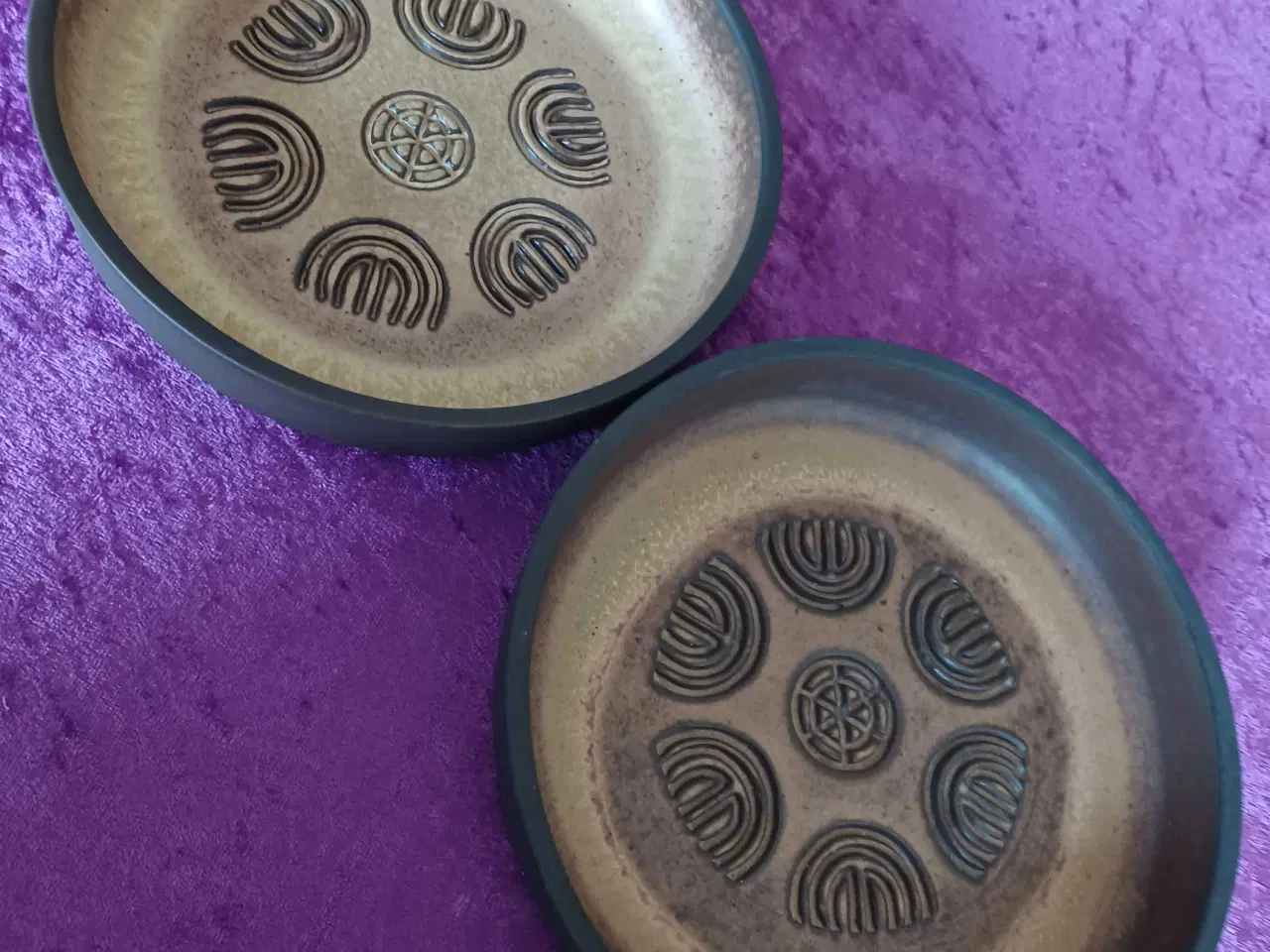 Keramik, 2 stk Fade, Frank Keramik, Retro, er af god Dansk kvalitet, en serie af flot design, Er karakteristisk ved det fine spil. mellem det rå keramik og den flotte glasur nederst. fremstår pænt og velholdt, men med brugs spor. Højde: 3,5 cm, D: 20 cm Samlet pris: 300