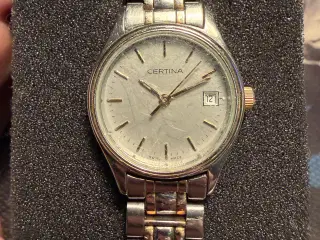 Certina 1888 dameur Farve: sølv/guld. Brede: 2 cm. Materiale: rustfrit stål og saphire crystal. Vandtæt ned til 100 m. 2 ekstra led medfølger. Skal have nyt batteri i, virker ellers ubeklageligt. Fra ikke-ryger hjem. Meget pænt og velholdt, få overfladiske brugsridser. Nypris: 2.999,95 kr.
