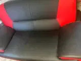 3 pers sort sofa i kunstlæder, hvor man kan slå op så man har benene vandret ud ligesom man kan i biografen. Stor set ny har været brugt en sommer sæson i vores sommerhus. Men den er for stort til sommerhuset, så derfor sælger vi den igen. Ny pris 3500,-