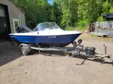 Ældre 16 fods almarine speedbåd sælges Båden er monteret med 40hk mercury 2 takter med elstart som går rigtig godt. selvblanderen er pillet fra så man skal selv blande olie i benzinen. Båden har hydraulisk styring, diverse lys, horn, et lille anlæg samt en ældre garmin fishfinder som desværre har lidt dårlig forbindelse i stikket (jeg ville nok skifte den ud hvis det var noget man skulle bruge til at fiske med) Fin lille skiv som trænger til lidt nussen og pudsen, men da jeg har fået en større båd får jeg den ikke brugt. Ønsker man at købe traileren med skal hele sættet koste 20000, der er plader og papire på traileren men køber søger selv for syn og omregistering af denne. Besvare sjældent ukendte numre så ved henvendelse send evt en SMS først